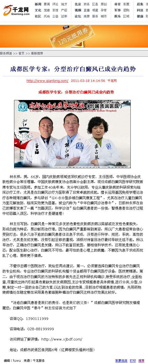 千龙 “成都医学医生:分型治疗白癜风已成业内趋势”